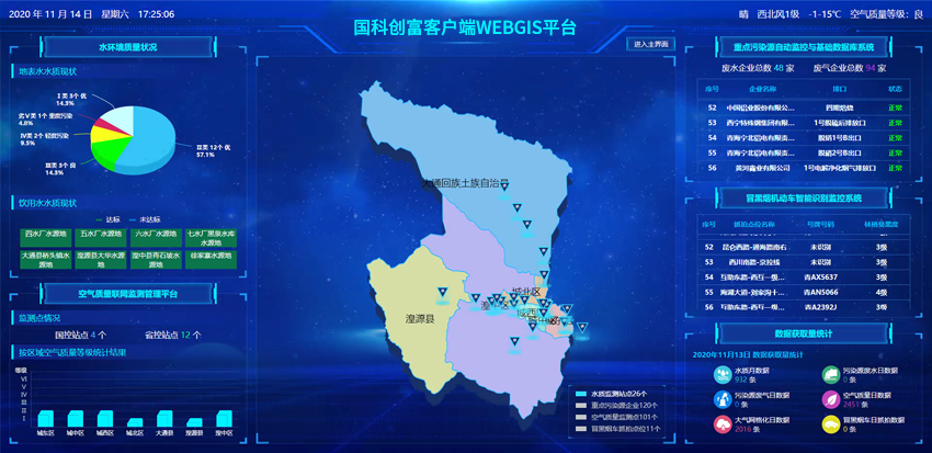 具有功能可定制的大数据看板功能,可以展示专题图、统计图(饼状图、柱状图、曲线图、雷达图、散点图、热点图、条形图、扇形图、折线图和象形图等),可监控资源环境数据服务的调用情况、物联网的实时数据采集情况和预警预测的结果状态等。