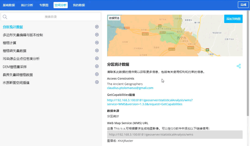 可以将不同的数据集发布为标准的服务(WMS、WFS、WCS和WMTS等),并且添加到数据服务管理面板,支持数据集服务的元数据管理,元数据管理功能模块可实现数据的预览、数据属性描述、相关信息超链接和数据获取权限地址生成等功能,也可以生成数据服务的共享链接,便于和第三方进行数据资源的共享。