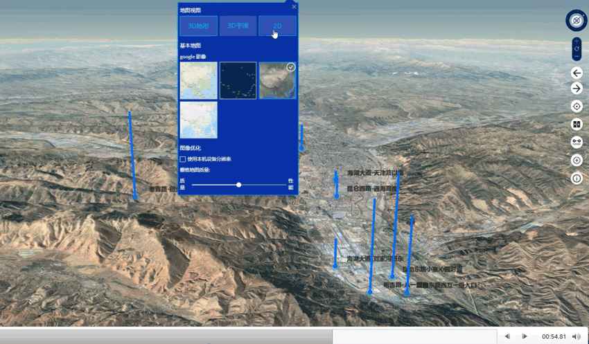 国科创公司的富客户端WebGIS平台具有丰富的空间数据浏览功能,包括各种各样的“一张图”地图获取和预览、二维电子地图浏览、三维场景浏览和统计分析二三维可视化等。在空间数据浏览工具栏,除了常规的浏览工具,还具有浏览质量控制、空间数据卷帘、视图书签和视图切换等功能。