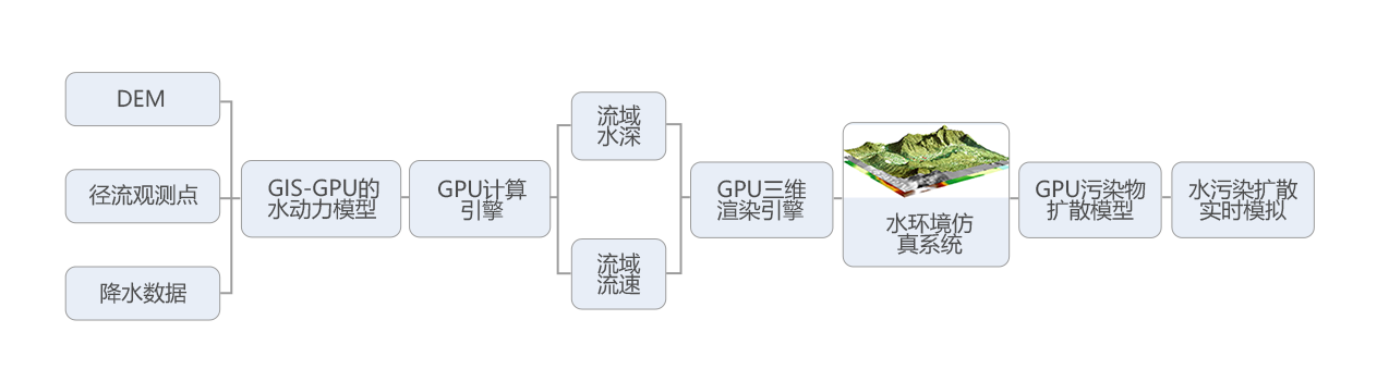 该系统主要应用于洪水淹没模拟和突发污染事故模拟两个方面,水污染的动态模拟仿真构建在水动力模拟的基础之上。在洪水淹没模拟中,系统将已有径流数据和降水预报数据作为边界条件,通过地理信息系统(GIS)和图像处理单元(GPU)技术构建水动力动态模拟模型和二三维可视化渲染引擎,形成洪水模拟仿真系统。在污染物模拟中,将已有径流数据、实时降水数据和污染物浓度数据作为边界条件,通过水动力模型获取径流状况,以流速和流量作为污染扩散的重要基础模拟参数,结合污染物的水体传播特性,根据污染物对流扩散模拟模型,进行二、三维污染动态传输过程模拟,并且实现基于GPU的仿真可视化,极大地提高了模拟的实时性和效率。