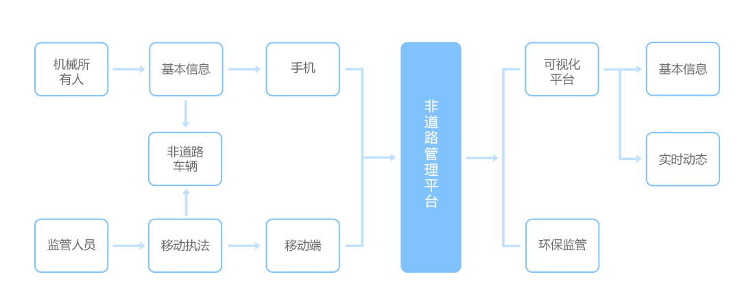 非道路移动机械数量占机动车保有量比例不高,但是其排放污染贡献率却一直居高不下,随着蓝天保卫战的深入推进,我国非道路移动机械的排放标准和管理也越来越严格。该解决方案可以管理非道路机械的基本信息,监管其使用区域,掌握机械使用的动态信息,并为机械使用者提供使用申报和检测预约等服务,配合生态环境部门做好机械环保标识管理,同时可为城市大气污染源构成和空气质量变化分析提供基础数据支撑。